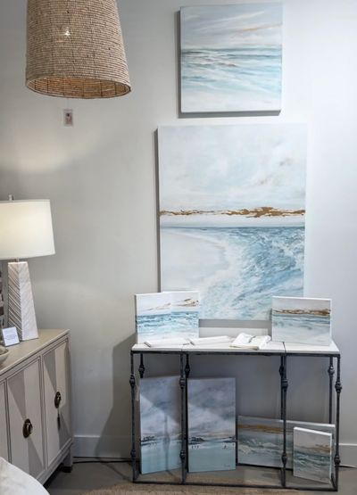 Beau Interiors in Grayton Beach, Florida offers a unique shopping experience which showcases my artwork featuring coastal vibes and 24K Gold Highlights as shown in this photo.